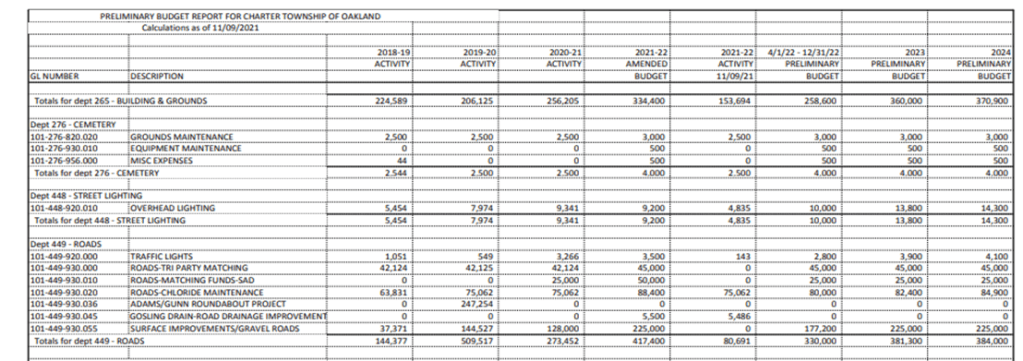 The 2022 proposed preliminary budget can be seen at this link to the 12-14-21 meeting packet starting on page 100. Roads are on page 108. (or see eye chart below)