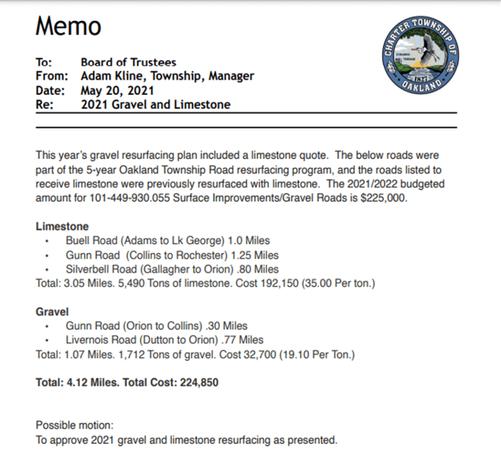 The proposed Toads budget (Dept. 449) is $381,000 with the bulk, $307,000 going for gravel and dust control on our dirt roads. All the Road Commission for Oakland County will do without extra funds from the township is periodically grade the dirt. No paving or pavement repair projects are budgeted by our Township as far as I can see. So this represents what our hired Township Manager is recommending to our Board.