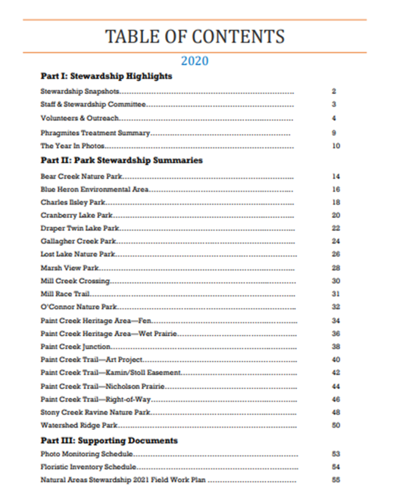 Below is the table of contents for the 2020 Annual Report, showing where Stewardship efforts took place.