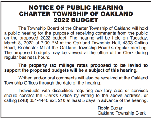 Budget Hearing, March 8th, Your Chance to Speak Up, Generally No One Does February 27, 2022February 27, 2022 Bob Yager This notice is in 2/27/22 Oakland Press. Share this: Click to share on X (Opens in new window) X Click to share on Facebook (Opens in new window) Facebook Like Loading... Related