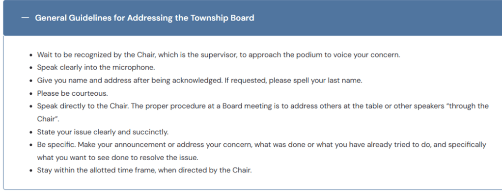 The above box came from the township website here under “General Guidelines for Addressing the Board”