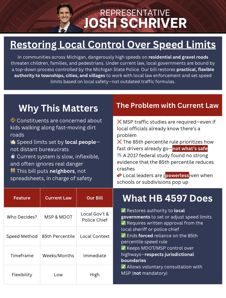 Please consider calling members of the Michigan House of Representatives Transportation and Infrastructure Committee to ask them to bring HB-4597 “Restoring Local Control over Speed Limits” up for consideration and ultimately pass it on to the full legislature for a vote. Unless this committee does that, HB-4597 will die in committee and will never even be considered.