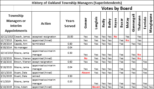 In some Townships, Orion for example the elected Township Supervisor (Dominic Abbate in our case) takes on all the duties now performed by Mr. Kline. Oakland Township had this system until Township Supervisor Joan Buser retired (about 1995). Then James Creech was hired as Township Manager and he served until 2013. Then we had a succession of managers,no manager and interim managers before Mr. Kline. The Board of Trustees decides which system to use.